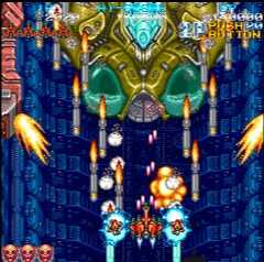 Also known as Truxton 2, this was the onlyhome version of Toaplan's frenetic arcade shooter, ported by Ving. With relentless waves of enemies, screenshots can never convey how intense things are. It's fast, very colourful, and makes good use of the system's capabilities. A simple power-up system, plus super bombs, keep everything intuitive despite the high difficulty. Regarded by many as the system's best shooter, better even than the system-exclusive Rayxanber.