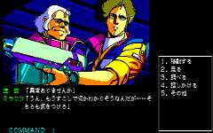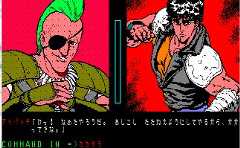 Predating the Sega Mark III version of Hokuto no Ken (aka: Fist of the North Star) by a few months, this little known graphic adventure by Enix was the series' true game debut. It follows Kenshiro and his companion Bat as they travel the post-apocalyptic wasteland searching for Ken's old nemesis Shin, who holds his beloved Yuria captive; events in-game do not resemble Tetsuo Hara's manga beyond the appearance of Shin and his four card-themed lackeys. In order to progress, players must investigate each scene to open new options. The sole unique feature is the battles, which allow players to choose which vital points to strike. Each enemy is vulnerable to a specific set, and to figure these out players must uncover clues or talk to villagers. (johnny2x4 of HG101)
