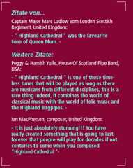 Die berühmte Dudelsackband Royal Scots Dragoon Guards, die 1972 für Ihren Welthit "Amazing Grace" mit 14 Goldenen Schallplatten ausgezeichnet worden ist, veröffentlichte die CD "Highland Cathedral" und eine gleichnamige DVD - eine musikalische Filmproduktion mit traumhaften Impressionen Schottlands (auch weitere CDs mit "Highland Cathedral":www.scotdisc.co.uk).