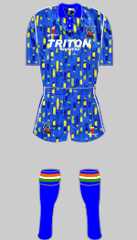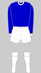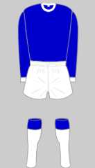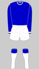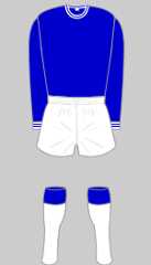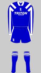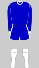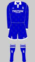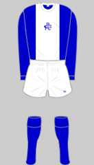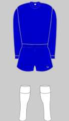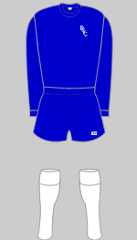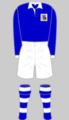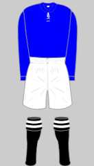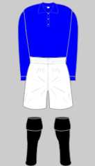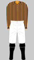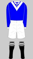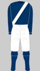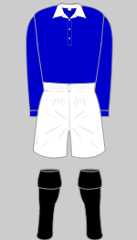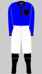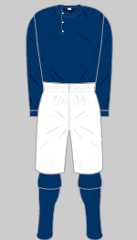 The club started out wearing dark blue jerseys but switched to amber and black after turning professional.An experiment with black tops in 1889 proved unpopular,players and spectators complaining that the team were virtually invisible. A set of royal blue jerseys were ordered for the following season but these were not delivered in time so the team turned out in their old gold-trimmed black tops for the first few games of the 1890-91 season. Although the shirts in the photograph above appear to be pale blue this is an illusion caused by the orthographic film stock used. All contemporary references describe the team as playing in "royal blue."
