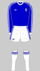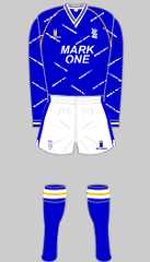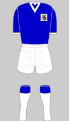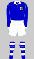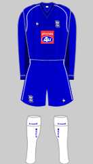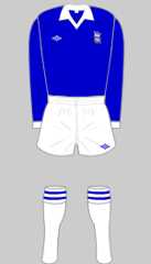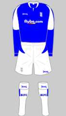 In 1905 the club changed its name to BirminghamFC ("City" was not added until 1944) in a bid to gain widersupport and a year later moved into St Andrews, the club'spresent home. After the First World War, wearing a darker shade of blue,the club became established in Division One, reaching the FA Cup Finalin 1931. 1939 brought relegation and after the Second World War, BirminghamCity, as they now styled themselves, moved between the two top divisions with some frequency.The change in name was no doubt engineered to encourage support from throughout the city and to emphasise this, the coat of arms of Birmingham now appeared on their shirts regularly although these had been the club's official crest since 1905 and made an appearance in the 1938-39 season. In 1956 Birmingham City finished sixth in Division One and were beaten finalists in the FA Cup for the second time - their most successful season to date.