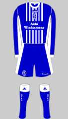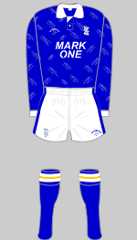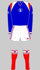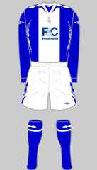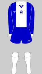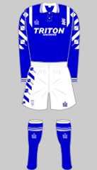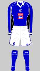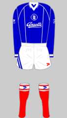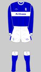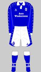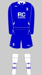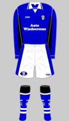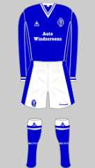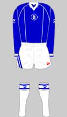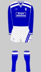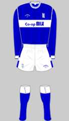 The Nineties brought a return to the second leveland by the new millennium, the Blues were regularly in contention forpromotion to the Premiership. Traditionalists, however, pointed outthat the shade of blue then in vogue was not the rich royal blue that is associated with the club. A version of the old monogramme crest made a brief reappearance in the 1996-97 season before