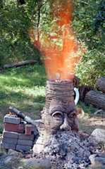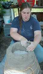 ![]() | The furnace could be built around a tapered wooden form, or simply by building it up from an earthen base (left), tying off the outside with rope to prevent sagging, and filling the inside with a sand/ash mixture to draw water out of the clay. As the clay dried, the wooden form or the sand/ash mixture was removed, and the drying was completed with a gentle wood fire inside the furnace (right). | ![]() |