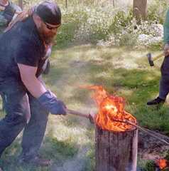 ![]() | Immediately after removing from the furnace, the remaining material was compacted with sledges to consolidate the material. This work is best done while the bloom retains the heat from the smelting process. A wooden log anvil (left) is often used, since the heat of the bloom burns a depression in the wood, helping to hold the bloom in position as it is worked. |