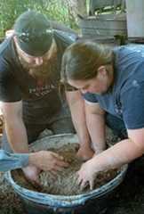 ![]() | The clay was actually a homogenous mixture of sand, fiber, clay, and water (left). The fiber was introduced into the mix as horse dung, in which the undigested hay provided the fiber. This mix had the needed structural properties to contain the smelting materials, as well as appropriate insulating properties. The walls must radiate enough heat to keep the inside surface from melting into the slag during the smelt. | ![]() |