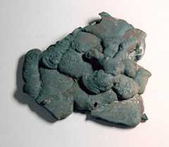 AtL'Anse aux Meadows, the iron was probably used to make rivetsand washers for ship repair. The wrought iron was rich in silicateimpurities, which formed a glassy surface on the iron. This isvisible on the parts even today (right). The surface helped protectthe iron from rust, even when immersed in sea water. | ![]() |
