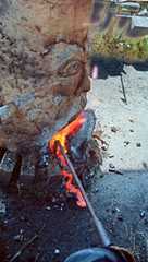 Tobegin the smelting operation, a fire was started inside the furnace with a naturaldraft, to prevent the thermal shock from rapid heating from damaging thefurnace. One warmed, an air blast was supplied through the side of thefurnace with a bellows, and the bore of the furnace was filled with charcoal. The photo to the right shows a modern replica furnace at the start of this process. Air was forced into the furnace through the tuyere, seen on the left side of the furnace. Archaeological evidence suggest that Viking-age furnaces used a tuyere made of copper. Our replica furnace used a modern (and affordable) ceramic tuyere. The placement of the tuyere seems to be a critical parameter in the success of these replica furnaces. This replica used air delivered by an electrically powered air pump. The air was adjusted to control the burn rate, and ore andcharcoal were regularly added to the top of the furnace in roughly a 1:1ratio (by weight). Inside the furnace, the temperature reached 1100-1300ºC(2000-2400ºF) at the bottom of the furnace near the iron. A reducingatmosphere was created, rich in carbon monoxide. The gas scavenged theoxygen from the iron compounds in the ore, converting them to elementaliron: