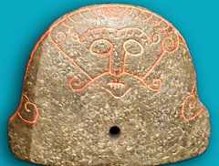 ![]() | This soapstone artifact was found in Denmark and is interpreted as a bellows shield with a depiction of Loki with his lips sewn shut, the result of his loosing his wager with the dwarf smiths Brokkr and Sindri,told in the myths. The stone is about 20cm (8in) across, with a hole near the base presumably to allow air from the bellows to reach the fire. |