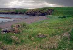 ![]() | The saga says that Skallagrímur couldn't find an anvil stone to suit him, so he rowed out into Borgarfjörður one evening in his boat. He dove to the bottom and brought up a suitable boulder for his anvil stone. The anvil stone, with its hammer marks, still stands at Rauðanes (left), but it has been moved away from the shore. Ruins (right), which are the probable site of Skallagrím's smithy, are located closer to the shore. | ![]() |