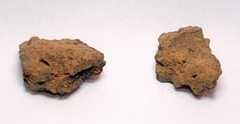 | The iron ore shown to the right was excavated from Skógar, a Viking-age iron-making site in Iceland. The larger piece is about 2cm (less than 1in) in the long dimension. Sometime about 1000 years ago, someone gathered this iron ore, processed it, transported it to the iron smelting site, but for unknown reasons, never used it in a smelt. Once the dry nodules or ore was in hand, the lengthy process of smelting the iron began. | ![]() |