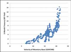One might argue that while short-term interest rates are essentially zero, long-term interest rates are not, which might leave some room for a "Hicksian" effect from QE - that is, a boost to investment and economic activity in response to a further decline in long-term interest rates. The problem here is that longer-term interest rates, in an expectations sense, are already essentially at zero. The remaining yield on longer-term bonds is a risk premium that is commensurate with U.S. interest rate volatility (Japanese risk premiums are lower, but they also have nearly zero interest rate variability). So QE at this point represents little but an effort to drive risk premiums to levels that are inadequate to compensate investors for risk. This is unlikely to go well. Moreover, as noted below, the precise level of long-term interest rates is not the main constraint on borrowing here. The key issues are the rational desire to reduce debt loads, and the inadequacy of profitable investment opportunities in an economy flooded with excess capacity. One of the most fascinating aspects of the current debate about monetary policy is the belief that changes in the money stock are tightly related either to GDP growth or inflation at all. Look at the historical data, and you will find no evidence of it. Over the years, I've repeatedly emphasized that inflation is primarily a reflection offiscal policy - specifically, growth in the outstanding quantity of government liabilities, regardless of their form, in order to finance unproductive spending. Look at the experience of the 1970's (which followed large expansions in transfer payments), as well as every historical hyperinflation, and you'll find massive increases in government spending that were made without regard to productivity (Germany's hyperinflation, for instance, was provoked by continuous wage payments to striking workers). Likewise, real economic growth has no observable correlation with growth in the monetary base (the correlation is actually slightly negative but insignificant). Rather, economic growth is the result of hundreds of millions of individual decision-makers, each acting in their best interests to shift their consumption plans, saving, and investment in response to desirable opportunities that they face. Their behavior cannot simply be induced by changes in the money supply or in interest rates, absent those desirable opportunities. You can see why monetary base manipulations have so little effect on GDP by examining U.S. data since 1947.Expand the quantity of base money, and it turns out that velocity falls in nearly direct proportion. The cluster of points at the bottom right reflect the most recent data.