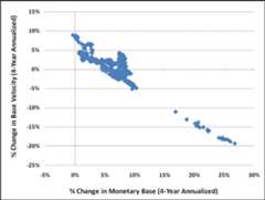 [Geek's Note: The slope of the relationship plotted above is approximately -1, while the Y intercept is just over 6%, which makes sense, and reflects the long-term growth of nominal GDP, virtually independent of variations in the monetary base. For example, 6% growth in nominal GDP is consistent with 0% M and 6% V, 5% M and 1% V, 10% M and -4% V, etc. There is somewhat more scatter in 3-year, 2-year and 1-year charts, but it israndom scatter. If expansions in base money were correlated with predictably higher GDP growth, and contractions in base money were correlated with predictably lower GDP growth, the slope of the line would be flatter and the fit would still be reasonably good. We don't observe this.] Just to drive the point home, the chart below presents the same historical relationship inJapanese data over the past two decades. One wonders why anyone expects quantitative easing in the U.S. to be any less futile than it was in Japan.