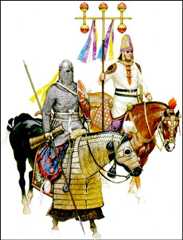 | | Heavy Armoured Sassanian Cavalry | More interestingly, the most important Byzantine treatise on the art of war, theStrategicon, also written at this period, requires the same equipments from a heavily-armed horseman. This was due to the gradual orientalisation of the Roman army to the extent that in the sixth century"the military usages of the Romans and the Persians become more and more assimilated, so that the armies of Justinian and Khosrow are already very much like each other;" and, indeed, the military literatures of the two sides show strong affinities and interrelations. According to the Iranian sources mentioned above, the martial equipments of a heavily-armed Sassanian horseman were as follows: helmet, hauberk (Pahlavigriwban), breastplate, mail, gauntlet (Pahlaviabdast), girdle, thigh-guards (Pahlaviran-ban), lance, sword, battle-axe, mace, bowcase with two bows and two bowstrings, quiver with 30 arrows, two extra bowstrings, spear, and horse armour (zen-abzar); to these some have added a lasso (kamand), or a sling with slingstones. The elite corps of the cavalry was called "the Immortals," evidently numbering-like their Achaemenid namesakes 10,000 men. On one occasion (under emperor Bahram V) the force attacked a Roman army but outnumbered, it stood firm and was cut down to a man. Another elite cavalry group was the Armenian one, whom the Persians accorded particular honour. In due course the importance of the heavy cavalry increased and the distinguished horseman assumed the meaning of "knight" as in European chivalry; if not of royal blood, he ranked next to the members of the ruling families and was among the king's boon companions.