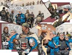 Hmm. More oddly-shaped, crooked panels showing people with guns. Middle Easterners. Aha! The “locals” mentioned, and seen on the walls in the background of the first panel. I wonder for a moment if there’s some significance to the way these little images are strewn around, shrug, and go looking for the next words to read…