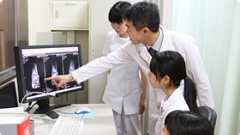 画像を先生と見て正しく撮影されているか確認しています。また、膝の疾患が画像にどのようにあらわれるかなどの説明を受けています。