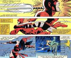 В Сорвиголове я нашёл прекрасную возможность донести свои мысли… У меня появились условия для создания криминального комикса, какой бы я сам хотел прочесть. За основу я взял «Мстителя» Уилла Эйснера. У его героя была маска, у моего — красное трико.Миллер решил объединить яркие героические комиксы с антуражем нуарных детективов, мрачной атмосферой безысходности, липким страхом, пронизывающим повествование, угрюмыми персонажами, которые не ждут ничего хорошего от жизни, роковыми красотками и могущественными злодеями. Это была ещё проба пера, робкие идеи и полунамёки на то, чем станет творчество Миллера гораздо позже. Шёл поиск собственного стиля, отработка навыков.