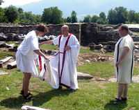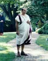 Always made of wool, and coming in a variety of colours for various uses, thetoga is more than a mere bedsheet. At the very least, it should be semicircular in outline, but a more genuine effect is obtained by having the outline of the toga in the following shape: