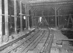 As part of the West Side Line construction, a second loop track andplatform was constructed on the inside of the first. The tracks wereconfigured in such a way that the inner loop and platform was directlyconnected to the tracks from Bowling Green, and the outer (earlier)loop and platform would be served by the trains from the West Sideline. Essentially a separate station, the South Ferry inner loopplatform was used until 1977, mostly by a shuttle to the Bowling Greenstation on the Lexington/Brooklyn IRT. Because of the sharp curve(even sharper than the outer loop), trains could open only theircenter doors at the inner loop station, and so instead of a fullplatform face, the platform was mostly walled off from the track witharched openings along the wall where the cars' center doors wouldbe. Starting in the late 1950s, when the new R-type cars displacedmost of the original IRT rolling stock, trains arriving from theLexington line on nights and weekends were rerouted to share the outerloop, because on the new cars it was not possible to selectively openonly the center doors. The weekday shuttle used specially modifiedcars that opened only center doors, and continued using the inner loopuntil service ended in 1977. The track past the inner loop is stillused to turn the #5 train when it is terminating at Bowling Green andnot running to Brooklyn. The inner loop platform at South Ferry is nowused for crew quarters, offices, storage, etc. and has a separateentrance from the fare zone upstairs. There was no free transferbetween trains on the two platforms. The platform walls on the innerloop station were decorated with small mosaic friezes similar to thosefound at other Dual Contracts-era stations.