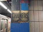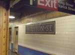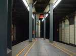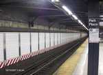 Two tracks, one narrow island platform. This is a fairly deep station;although built first it runs east-west underneath theIND 8th Avenue/Fulton Street/Rockaway Line, which runs geographicallynorth-south. At the east end is a long escalator, and a closedstairway with a mechanical room over the platform. Most of the stationhas a high ceiling. The only mosaic is a small "P" on the tracksidewalls. Exits are at Church Street and Broadway.