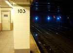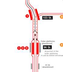 Section 6B, Center of West 82nd Street 1.07 miles northunder Broadway to the center of West 104th Street. This sectionincluded the junction of the "West Side" branch and the "East Side",or Lenox Avenue, branch north of 96th Street, as well as the stationsat 91st Street (now closed), 96th Street (express), and 103rd Street.North of 96th Street the express tracks descend and turn eastwardnorthward, becoming three tracks, to the station at 103rd Street. Somelast minute design changes added the third track northbound, and aprovision for a third track was also built into the lower level Lenoxbranch of the junction. This accounts for the extra space seenalongside the active tracks in this area. Construction of this sectionbegan on August 22, 1900. Service in this area was originallyoperated with some locals and some express trains entering bothbranches, causing a bottleneck at the crossovers at the junction. Asearly as 1908 improvement was sought in this area by planning extraflyunder tracks, which were never built. Better signalling wasinstalled instead; but by the 1950s it was decided that all of theexpress trains would head toward Lenox Avenue and all of the localtrains would continue north along Broadway, which remains theoperating pattern today.