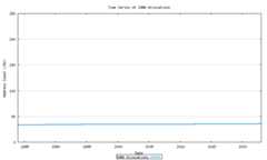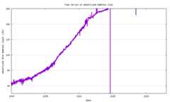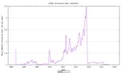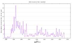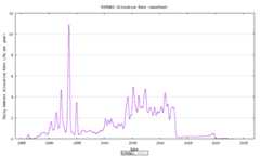 The approach used here to modelling overall address consumption levels is to use the RIR allocation information as the baseline of the address consumption model. This approach treats an address as "consumed" once it has been allocated or assigned by an RIR. The data used to construct the time series of allocations is the allocation "stats file" published on a daily basis by each RIR, placed into a time series, as indicated in Figure 9. The first order differential of the smoothed total allocation rate can be generated, as shown in Figure 27. A least squares linear best fit can be generated for the recent part of this data.