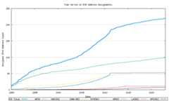 RIRs perform assignments of address blocks to ISPs and local Internet registries. The cumulative number of assigned addresses over time is shown in Figure 8.
