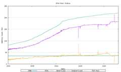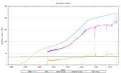 The foloowing figure constructs a relatively complete view of the sequences of various address pools over time. Figure 16 shows the total amount of space allocated by the IANA to the RIRs, the total amount of space that has been allocated by the RIRs, the total amount of space advertised in the routing table, the total amount of unadvertised space that has been allocated, and the total amount of address space that is held in the RIR's local allocation pools. This is indicated in Figure 16. The objective here is to generate a predictive model that can be used to extend these series forward in time in order to estimate a point of exhaustion of the unallocated address pool