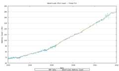 The next data set is total span of address space advertised in the BGP routing table over time. The data has been collected since late 1999. This is shown in Figure 11.