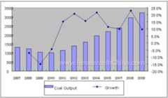 | |  | China is short of oil and gas resources while coal resources are relatively abundant. Due to the oil shortage as well as the high price, the application of advanced coal transformation technology is positive to reorganize the chemical industrial structure. Moreover, it is also a strategy for China to be more independent on oil imports, to better-control the environmental pollution as well as to ensure the energy security and to maintain sustainable economic development in the 21st century. China's raw coal output in 2005 totaled at 2.198 billion tons with a year-on-year growth of 12.37%, which increased by double compared to 998 million tons in 2000. The annual compound growth was 17.10%. The output in 2004 was 1.956 billion tons with a year-on-year growth of 13.2%, up 228 million tons. However, coal shortage still exists. Statistics and Forecast of Coal Supply in China, 1997-2009 (Unit: million tons)