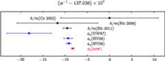 さまざまな方法で決めた微細構定数αの逆数値から、完全に一致をみている最初の6桁分137.036を差し引いたもの。h/mは原子の反跳測定を示し、Cs2002はセシウム原子を用いたチューらの2002年の結果から、Rb2006とRb2011はそれぞれルビジウム原子を用いたビラベンらの2006年と2011年の実験結果から導かれたαの値を示している。aeは電子の磁気能率によるもので、UW87は1987年のデーメルトらの実験と2007年のQED計算、HV06, HV08はそれぞれガブリエルスらによる実験と2007年のQED計算によるもので、newはHV08の実験と今回のQED計算に基づくものである。