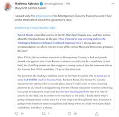 "That field" also includes businessmanDavid Blair, businessmanPeter James (who just filed for the race yesterday), and County CouncilmemberTom Hucker; no candidate of any other party affiliation has filed to run as of this morning. Yglesias also weighed in with a novel take on the Maryland governor's race, predicting Peter Franchot would top the Democratic field "based on name recognition and being white in a field with many Black candidates. And that's a shame."