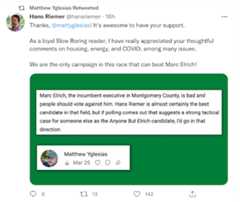 JournalistMatt Yglesias endorsed Montgomery County CouncilmemberHans Riemer in the Democratic primary race for County Executive Friday. In a tweet that displayed a portion of a recent blog post, Yglesias wrote, "I would vote for Hans Riemer." Yglesias, who reportedly lives in Logan Circle in the District, wrote that incumbent executiveMarc Elrich (D) "is bad and people should vote against him. Hans Riemer is almost certainly the best candidate in that field."