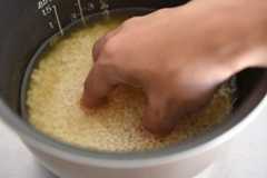はじめに2合の米は、炊飯器の内釜などに入れて研ぎます。水を何度か入れ替えたのち、2合の目盛りにきっちり合わせて水を入れ、30分から1時間そのまま置いて浸水させます。