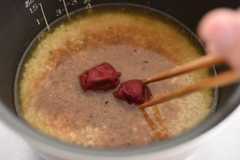 手でやさしくかき混ぜて、調味料を溶かし、そこにだしブレンド大さじ1と1/2、梅干し2~3個を加えます。