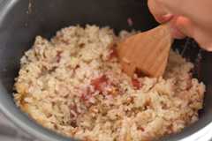 ※工程①での米を浸水させる時間が取れないときは、研いですぐの米と具材を上のようにセットして、炊き込みご飯コースで炊いてください。