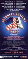 A Celebration of the work of Stephen Sondheim Opened July 19, 2000 at the Bridewell Theatre, London Closed August 19, 2000; Ran for 32 performances Produced by the Bridewell Theatre Company [Theatre Director: Carol Metcalfe; Artistic Producer: Clive Paget; Executive Producer: Time Sawers] Devised and directed by David Kernan Co-deviser: John Kane Musical supervision and arrangements: Jason Carr Choreographer: Warren Carlyle Design: Peter Docherty Lighting: Matt Eagland Musical Director: David Laughnarne | CastGeoffrey Abbott Linzi Hateley Belinda Lang Robert Meadmore Angela Richards