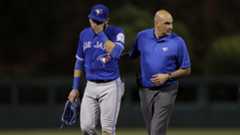 Blue Jays right-fielder Jose Bautista walks off the field after suffering an injury in Philadelphia. (Matt Slocum/AP)