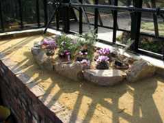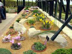 The small sideways extension to the house creates a bed too wide for us to reach to plunge pots at the back. We decided to use this space to create a permanent display. We have made it as a sand bed (encouraged by the success of our new sand beds outside) and have used tufa for some rockwork. Kathryn decided she would like to mainly show Saxifrages in here. So we have planted it with many of the Porphyrion group (Kabschias) and a few silvery encrusted types. To give a bit more interest when these are not in flower, about a quarter of the planting is not saxifrages but a mix of other alpines. This was the result: