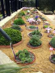 We are extremely happy with the new house - you can see it has oodles of ventilation on both sides and ridge and shading provided by roll-down 'aluminet' type shading cloth. When you walk in, the extra height gives the house a feeling of being larger and more spacious than the old one and helps too with keeping the house cool. We soon set about making good the plunges and moving in the plants for our first display. We have a few slightly raised areas contained by stones in which we try and plant in a thematic way. The very first plants put in were in such an area and had a 'Cyclamen and fern' theme.