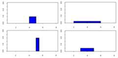 A random number generator acting over an interval of numbers(a,b) has a continuous distribution. Since any interval of numbers of equal widthhas an equal probability of being observed, the curve describing thedistribution is a rectangle, with constant height across the intervaland 0 height elsewhere. Since the area under the curve must be equal to 1,the length of the interval determines the height of the curve.The following graphs plot the density curves for random number generatorsover the intervals (4,5) (top left), (2,6) (top right), (5,5.5) (lower left),and (3,5) (lower right). The distributions corresponding to these curves areknown asuniform distributions.