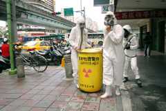 People in a busy shopping district in Taipei yesterday afternoon had a shock when they saw what looked like Taiwan Power Co (Taipower) employees in full protective suits moving a yellow barrel with a radiation hazard sign and the words “radioactive waste” on it.