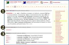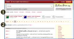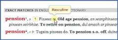 In the case ofFoclóir Gaeilge–Béarla andEnglish–Irish Dictionary, the layout and formatting of entries is almost identical to how they appear in the printed dictionaries, with some additional colour-coding. Grammatical and other abbreviations appear in green and you can get an explanation of what they mean by hovering the cursor over them; the explanation will appear in a little pop-up box.