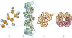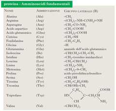 Le p. sono costituite da numerose molecole di α-amminoacidi, legate fra loro mediante legami peptidici tra il gruppo carbossilico di unamolecola e il gruppo amminico della successiva, costituendo nel loro insieme unacatena polipeptidica. Tra tutti gli amminoacidi presenti in natura solo 20 sono i costituenti fondamentali delleproteine. Con formula generale H2N-CHR-COOH, sono caratterizzati dalle diversità delle catene laterali (R), che differiscono fra loro per dimensioni, forma, carica, capacità di formare legami idrogeno e per reattività chimica. Queste caratteristiche conferiscono alla molecola proteica specifiche proprietà. Lasequenza degli amminoacidi lungo la catena polipeptidica è la diretta espressione dell'informazione genetica contenuta nel DNA (→codice genetico esintesi proteica).