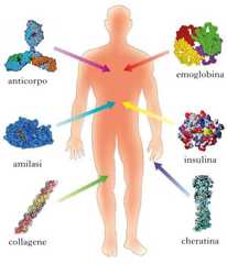 Esistono p. con funzioni di protezione (lacheratina delle unghie o dei peli), di sostegno (ilcollagene del tessuto connettivo) e p. specifiche, che svolgono attività fondamentali per lavita. Tale, per es., è l'emoglobina contenuta negli eritrociti, che ha funzione di fissare l'ossigeno e trasportarlo a tutte le cellule del corpo. Altre p. specifiche sono alcuni ormoni, come l'insulina, l'ormone ipofisario della crescita o quello dellatiroide, tutti regolatori di processi metabolici vitali. Esistono inoltre anche p. di difesa, come ilfibrinogeno del sangue che ne permette lacoagulazione, o gli anticorpi che l'organismo produce per difendersi dagli antigeni. Una importantissima classe di sostanze proteiche è quella degli enzimi.