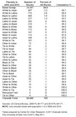 For this analysis, the Center for Urban Research calculated race/ethnicity plurality for a given area (such as neighborhood, tract, or Census block). Plurality of the population refers to the group with the largest number of people (not necessarily the majority) -- in other words, the predominant subgroup of the area's overall population. We used the Census Bureau'sblock relationship file to allocate 2000 population counts to 2010 geography. We then calculated the number and percent of people in each of the 5 major race/ethnicity groups (listed inthe note above) for each Census block in the city for 2000 and 2010. From there we identified the group with a plurality of each block's population. (Our methodology is explained more fullyhere.)