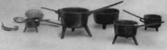 Various skillets. This kind of cookware has legs to raise it above the floor of the fireplace and coals.