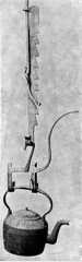 A favourite device for tipping a kettle without taking it off the firewas the idleback or lazyback (Figs. 61-2). It hung on the hanger andit will be seen from tlie illustration how the act of pulling downthe handle will tip the kettle. The hook nearest the spout has a springclip that keeps the front of the kettle handle down when it is tipped forpouring. The old smith who forged it could not resist the suggestion ofsnake-like form in the handle of the tipper, for he finished off the end ina little snake's head. If it is noticed that in the picture the kettle doesnot hang level, it is because it is the way it takes of itself after being tipped.