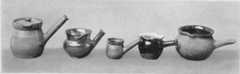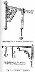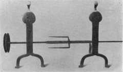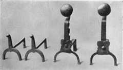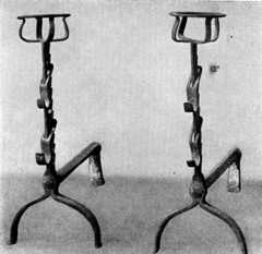 A simple form of iron firedog was in use in every cottage, generallyof low shape so as not to interfere with the swinging pot; the uprightfront being only high enough to stop a log of reasonable thickness fromrolling out forwards; and there were two loose iron bars that could beadjusted on the dogs so as to hold a cooking pot. But in some farmhouses,and even cottages, there were the tall-fronted cup dogs, with the topsframed in such a way as to hold a mug of hot drink.