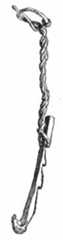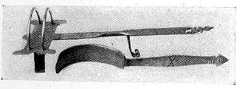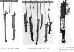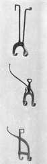 Some of the older hangers have an ornament at the top, usually a fleur-de-lys, or it might be a kind of lance head, or only a close curl of the end of the iron that connected the upper part of the ratchet with the upright bar (see "A" below). A rare example of a highly ornamented hanger is in the Victoria and Albert Museum. The loop that catches in the ratchet is decorated with elaborate scroll work and the lower part is pierced through, showing a silhouette of the smith at work, withsome of his tools above ("C" below).