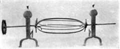 Nowadays we roast more conveniently by hanging the jointvertically to the clockwork jack ; this also is better suited to the narrowshape of our coal fires. But in the old days, when the fire was on thehearth and was large and wide shaped to take a large piece of meat, therewas no other way of roasting than the horizontal. For a heavy pieceof meat there were two usual forms of spit; one with two prongs whichheld it firm and the other, called a basket or cradle spit, in which themeat was enclosed, and held by a number of thin iron bars (see below).This was specially convenient for cooking a tender viand like a suckingpig, in whose case it was desirable to avoid piercing the meat and soletting out the succulent juices.